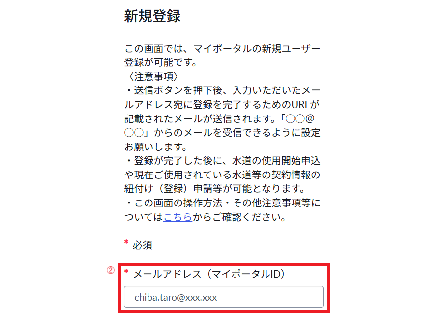 また、このメールアドレスは今後ログインする時や水栓契約との紐付けに必要になる「マイポータルID」になります。