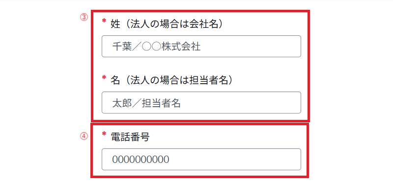 法人として登録になる場合は会社の名前を姓に、ご担当者様のお名前を名にそれぞれ入力してください。