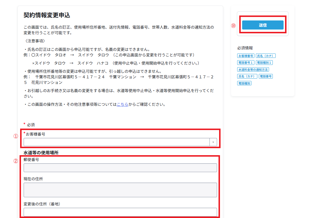 - この画面では、お客様の登録されている氏名が誤っている場合の訂正、使用場所住所番地の変更、送付先住所の変更、電話番号の変更、世帯人数の変更を行うことができます。