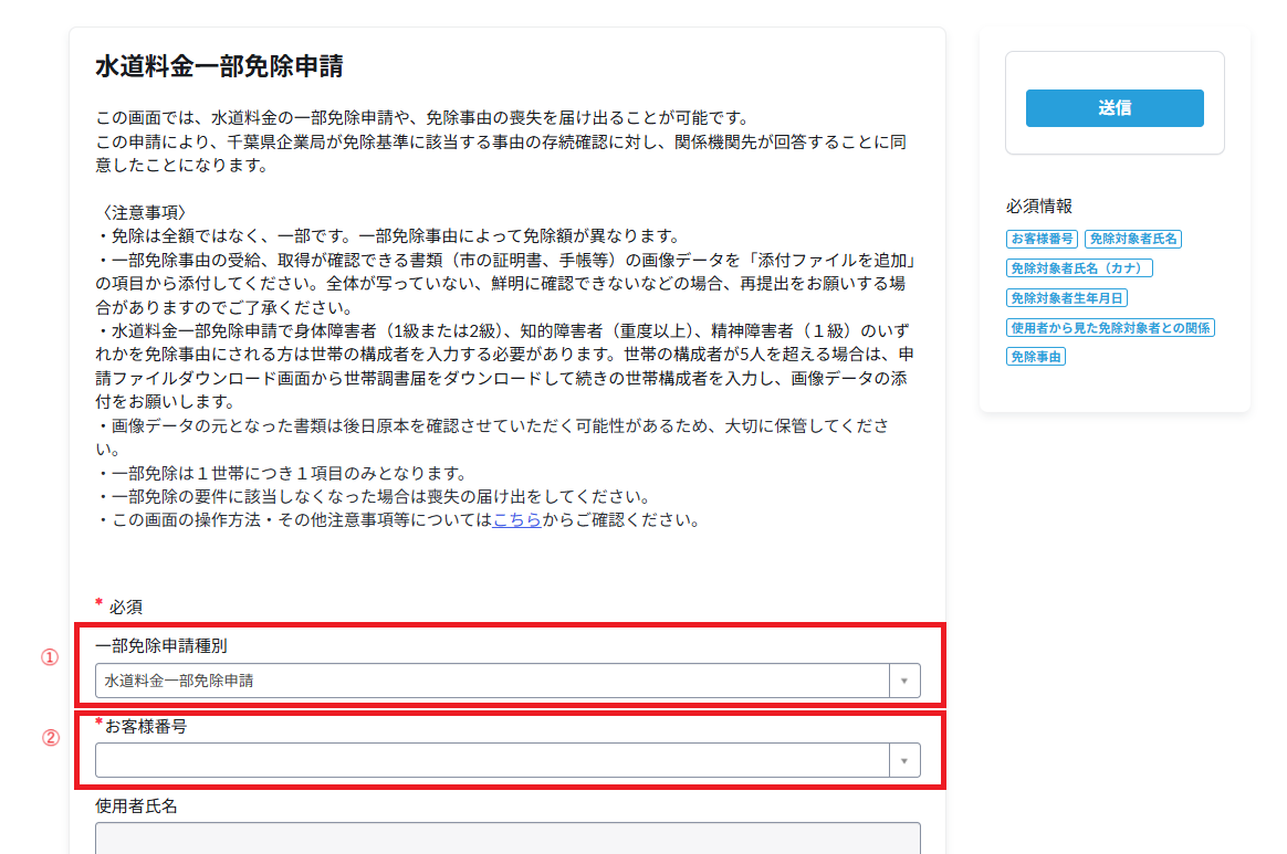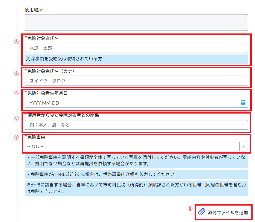 水道の使用者から見た③免除対象者び関係を入力してください。