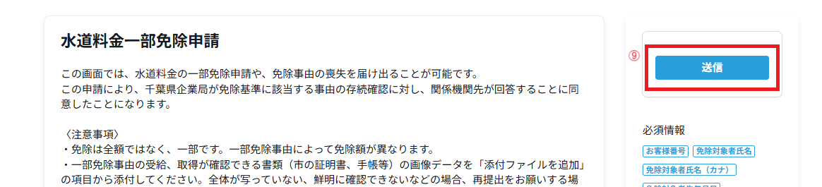 - この画面では、「水道料金の一部免除申請」または、「水道料金一部免除の喪失届」の申請を行うことができます。
