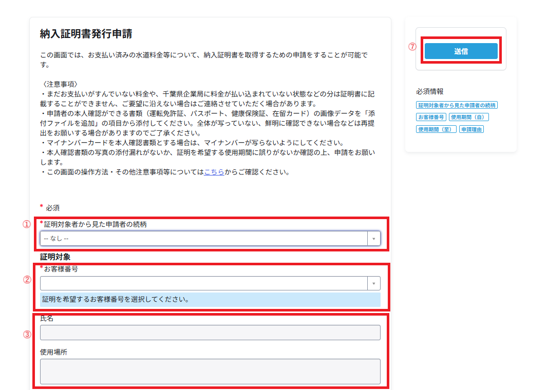 取得したい使用場所のお客様番号を選択し、証明書に記載してほしい使用期間の調定年月や必要な部数を入力してください。