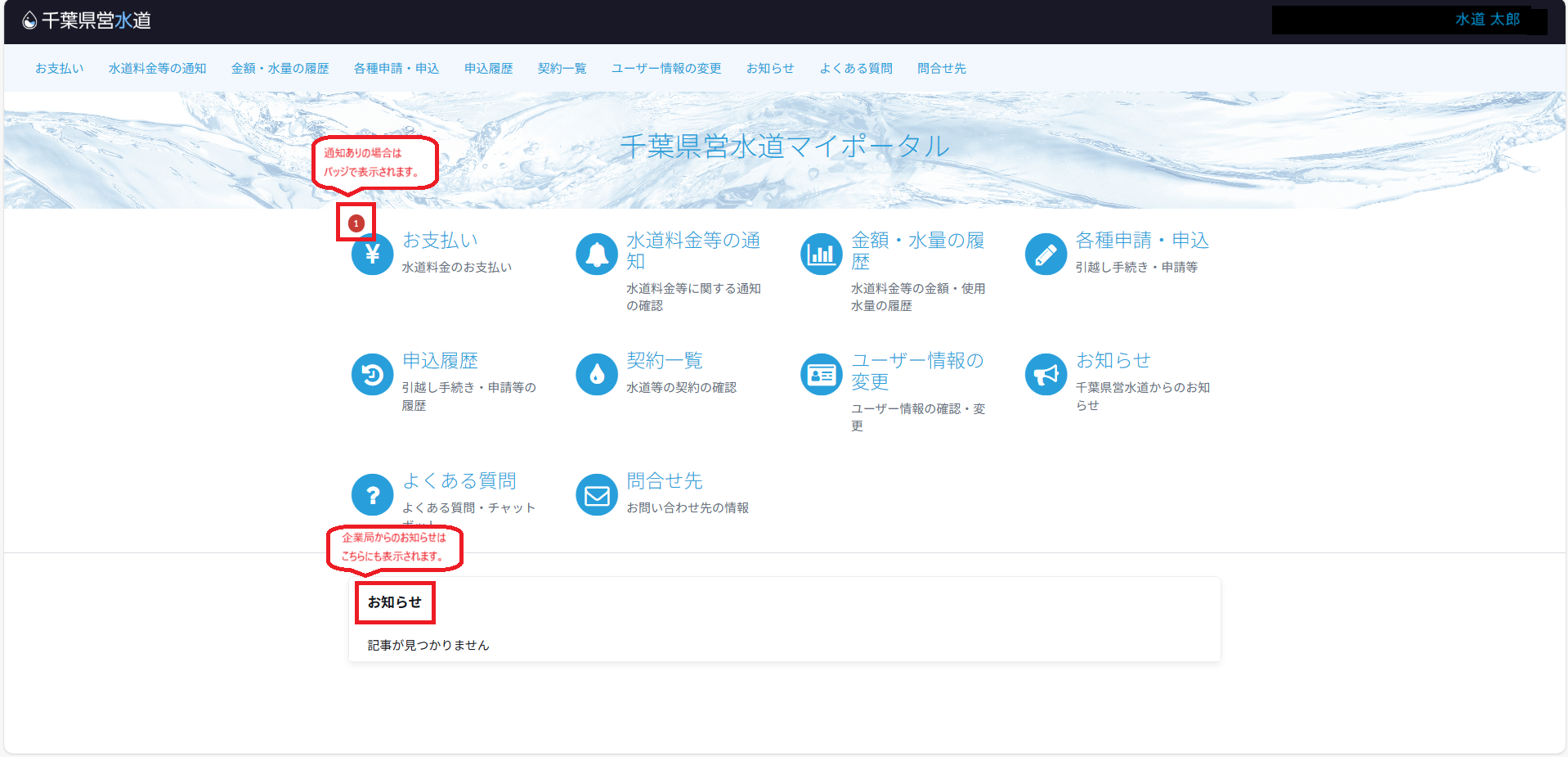 お支払いや水道料金等の通知等をそれぞれ表示しております。